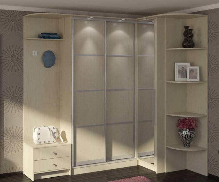 Выполненные углом или в виде трапеции. Такие шкафы распространены в помещениях, проектирование которых отличается от стандартов. Углубленность в подобных сооружениях не превышает 60 см.