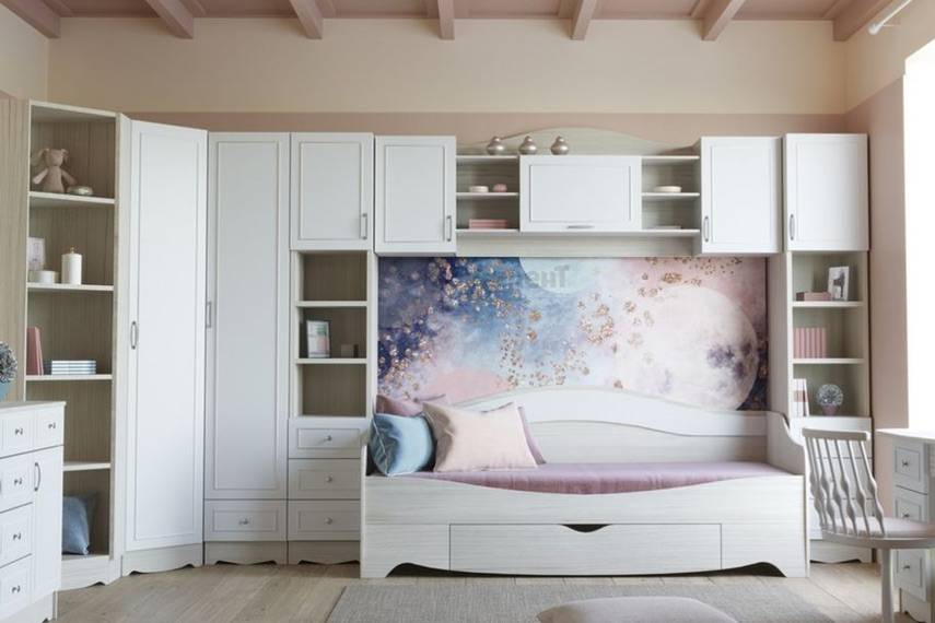 Шкаф стенка. Это обычная корпусная конструкция, которая может иметь распашные или купейные двери, антресоли, а также встроенную кровать для каждого из детей. Здесь уместны разноцветные ящички и дверки, отделка соответствующим декором.