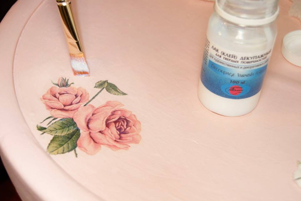 ВНИМАНИЕ: лак для декора мебели выбирается специальный, предназначенный для декупажа. При его отсутствии можно воспользоваться лаком для дерева