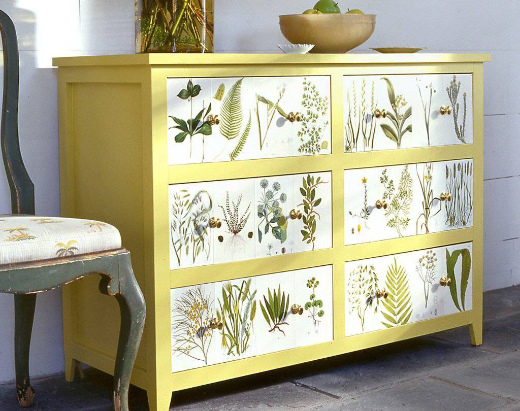 Затем приклеиваем их к конструкции. Разравниваем и удаляем пузырьки воздуха. Декоративные карты приклеивать не только на лицевой стране, но и по бокам. Итак, самые крупные детали рекомендуется размещать посередине. Более мелки снизу и сверху комода