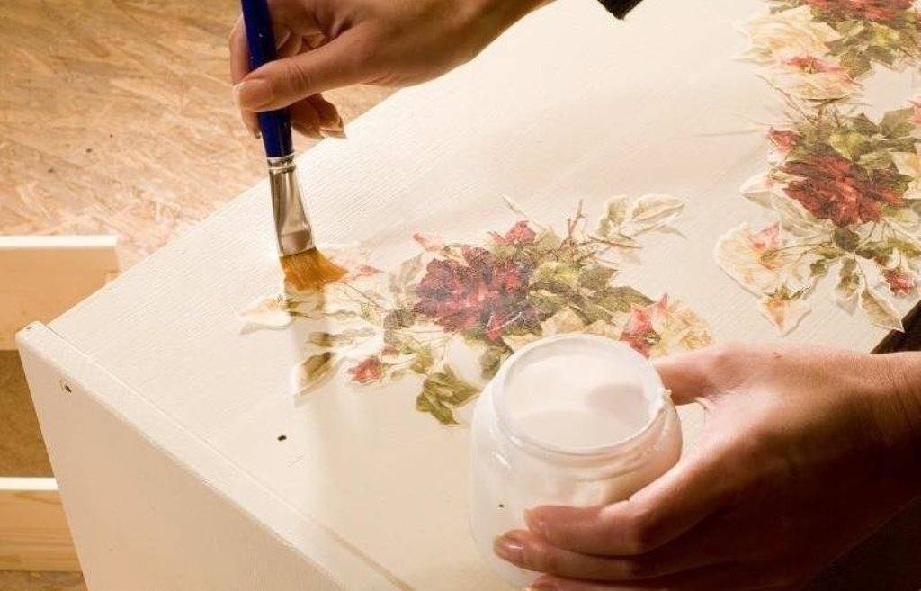 Самым сложным рабочим процессом в технике декупажа является аккуратное нанесение салфеток на поверхность. На них не должны образовываться складки или пузырьки от воздуха и комков клея. При работе стоит учитывать, что влажные от клея салфетки легко рвутся.