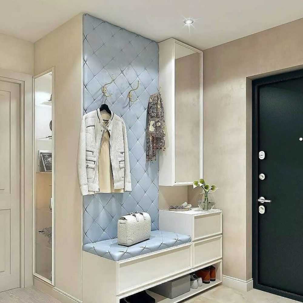В прихожих гарнитурах часто присутствует встроенная кушетка. Если помещение прихожей просторное, то можно установить мягкую объёмную кушетку напоминающую больше кресло. В маленьких коридорчиках кушетку прекрасно заменят банкетки и пуфы. Мягкая часть кушетки может быть из различных материалов от текстильных натуральных тканей до кожаного покрытия. Рядом с кушеткой можно разместить журнальный столик ил тумбу с декоративными ящичками.