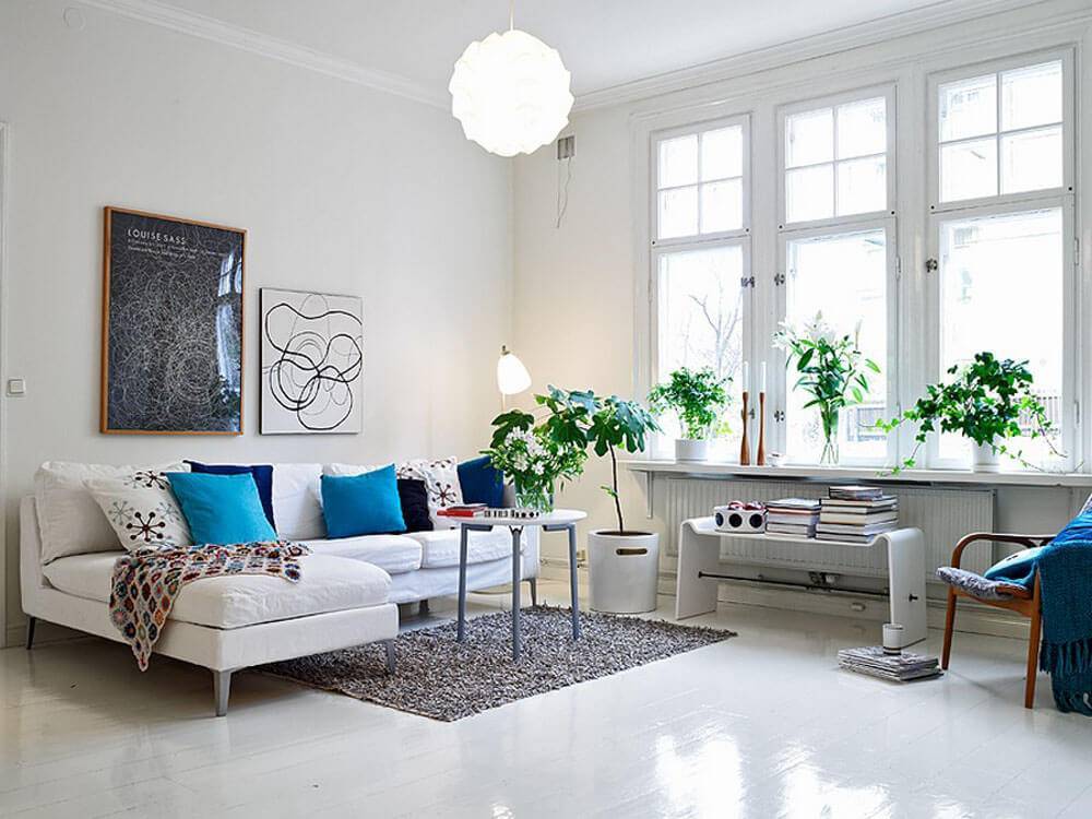 Скандинавские гостиные бывают самыми разными. Как правило, в них присутствует удобный диван, много искусственного освещения и зелени.