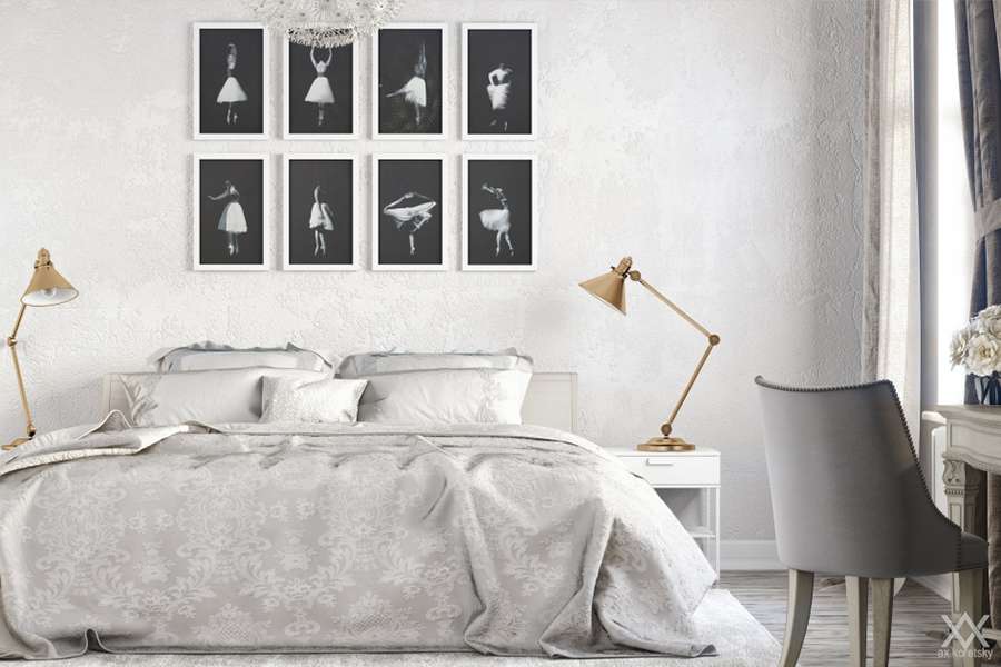 для оформления стен и потолков здесь выбираются преимущественно белые оттенки. Также гармонично смотрится сочетание белоснежного потолка со светло-серыми стенами;