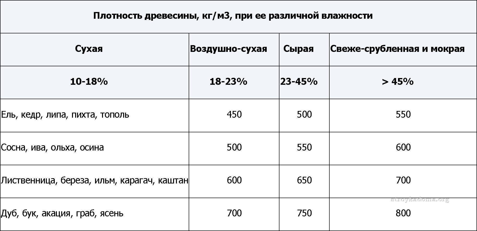Для абсолютно сухой древесины плотность будет ниже (равновесная влажность дерева для эксплуатации внутри помещений 6-8% ), а для естественной влажности выше.Естественная влажность не нормируется и может составлять от 30% до 80%. При эксплуатации дерева в контакте с внешней средой (любые наружние деревянные элементы дома,деревянные рамы окна, обшивка снаружи и т.д.) мы в аккурат попадаем в 12% влажности для которой и приведена таблица выше.