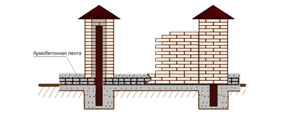 - Установка опорных столбов в полтора или два кирпича. На этом этапе осуществляется установка закладных для крепления наполнения или строительства простенка.