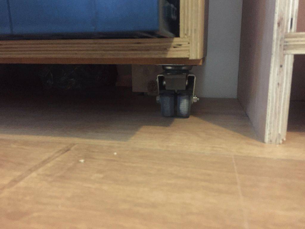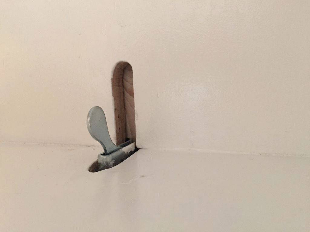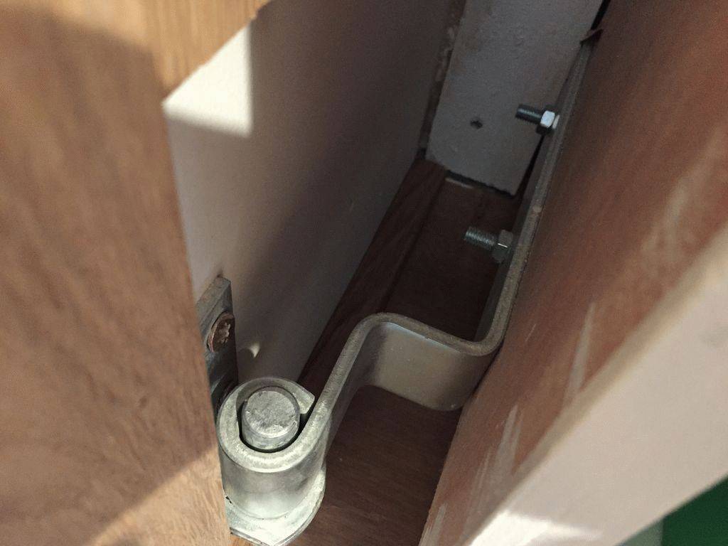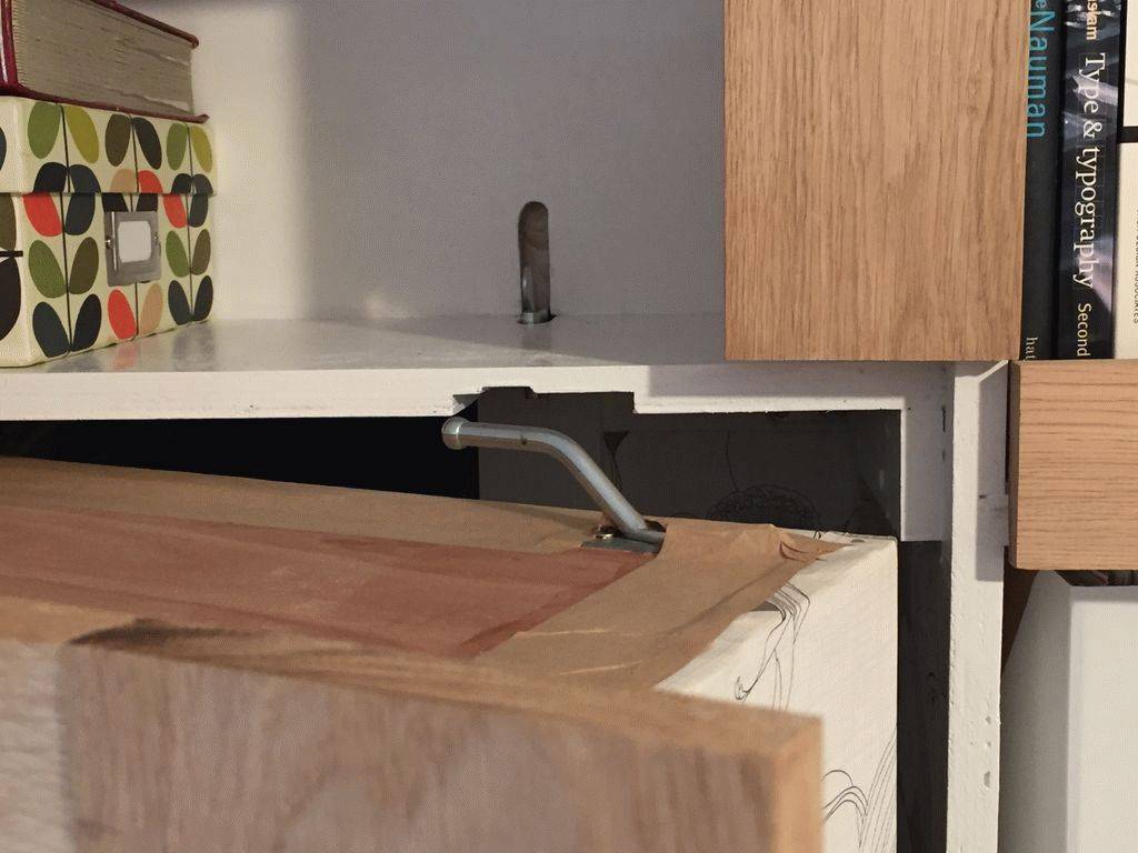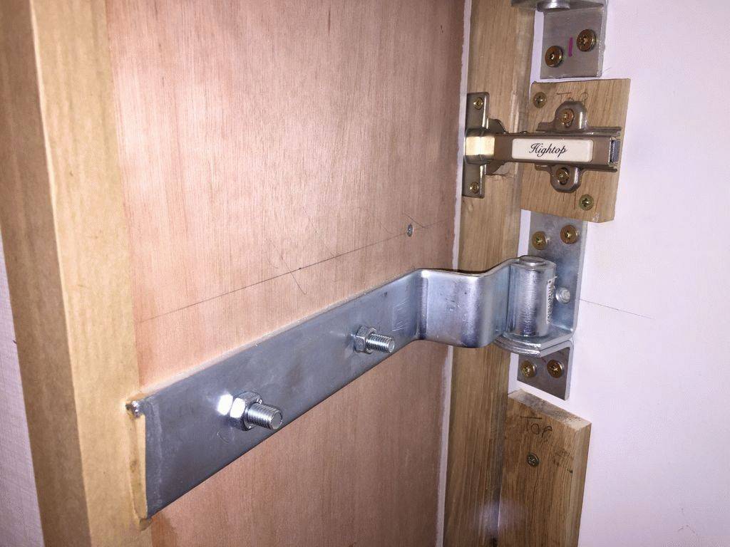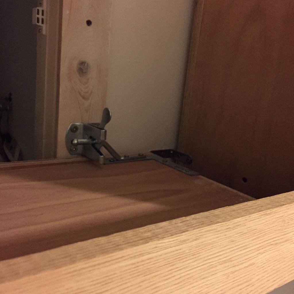 Вертикальная лицевая панель с левой стороны установлена на 3 старые петли от кухонного ящика. Они нужны для того, чтобы позволить панели двигаться в диапазоне минимум 90 градусов и позволить ей сидеть ровно по стене в открытом состоянии.