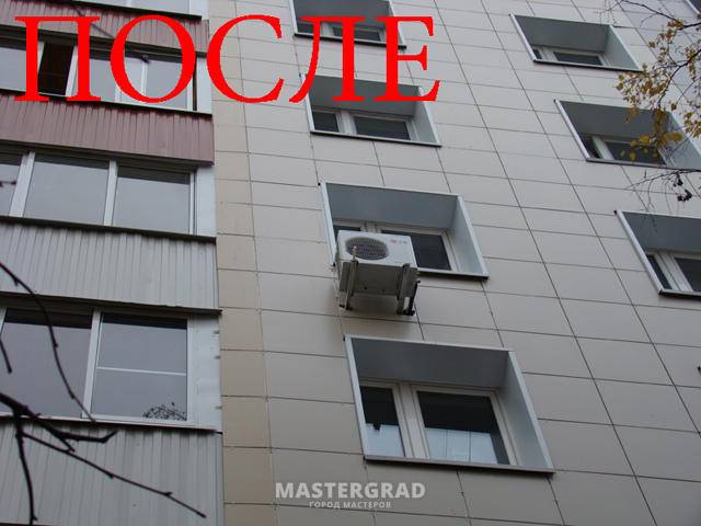 Многие используют этот вариант — внешний блок кондиционера размещают в лоджии. Это часть квартиры, и разрешение на установку не требуется. На вид фасада блок, скрытый в лоджии, никак не влияет. У такого способа есть свои недостатки.