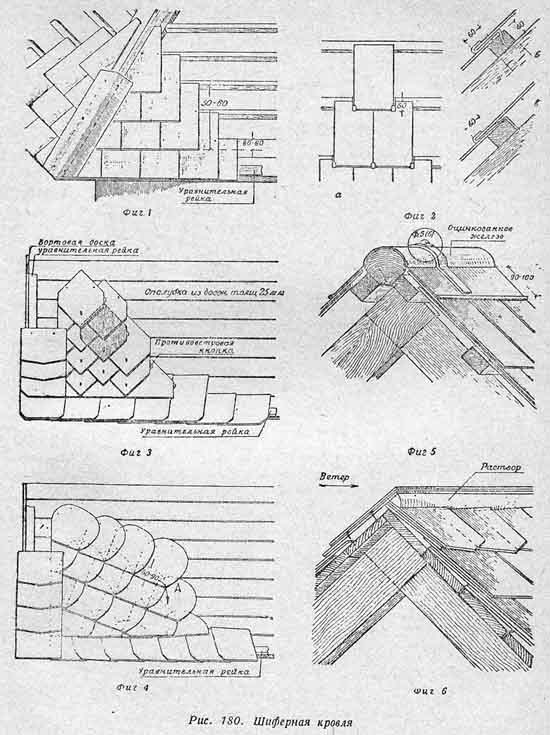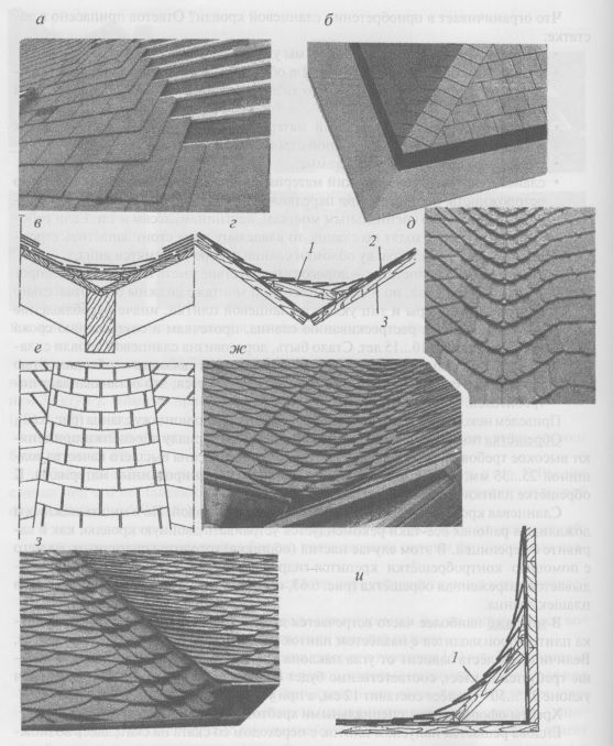 Детали монтажа сланцевых кровель: а – укладка сланцевой плитки в случае двойной кровли; б – оформление хребтов плитками; в-ж- схемы вариантов решений ендов и их виды; з, и- вид и схема кладки плиток при примыкании кровли к стене; 7 – плитки сланца; 2 – гидроизоляция; 3 – обрешётка.