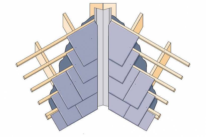 Ендова решается напуском плиток с переходом со ската на скат; здесь возможны варианты, которые зависят не только от параметров ендовы, в основном её ширины и глубины, но и от желаемого рисунка кровли.