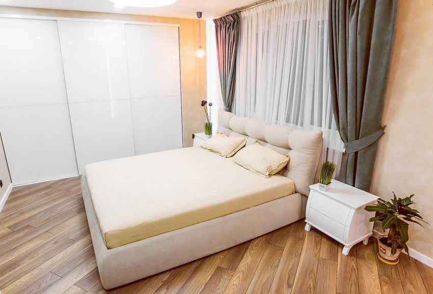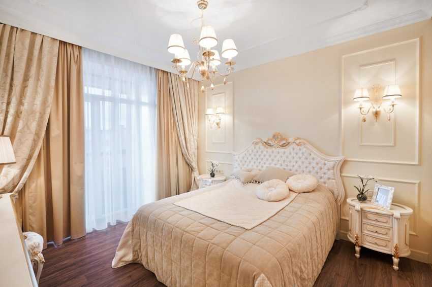 Оконные проемы в небольшой спаленке светло-песочного цвета желательно украсить композицией из полупрозрачной ткани