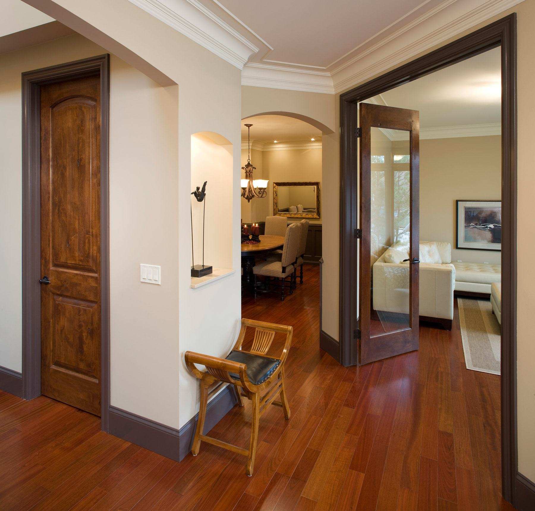 - использование наличников и плинтусов в тон двери. Этот способ спасает даже в тех случаях, когда между помещениями нет ничего общего, а дверь не сочетается ни со стенами, ни с мебелью, ни с напольным покрытием. Достаточно выбрать нейтральный оттенок двери и в ее тон сделать широкие наличники и плинтуса по всей квартире, что позволит создать единую цветовую линию по всей квартире;