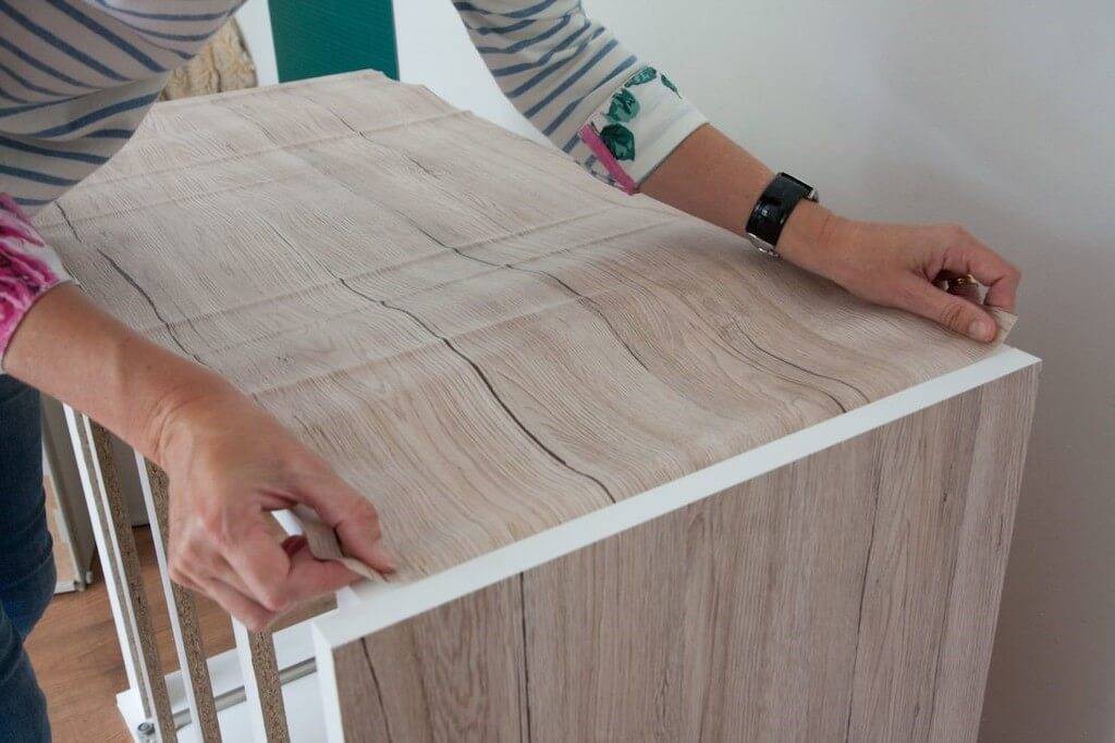 Другой способ обновить внешний вид деревянной столешницы — использование самоклеящейся пленки. Преимущество пленки в ее неограниченном количестве дизайнов — можно оставить рисунок дерева или же подобрать изображение мрамора, камня, кожи и даже металла. Перед тем, как клеить пленку, необходимо очистить столешницу и обезжирить.