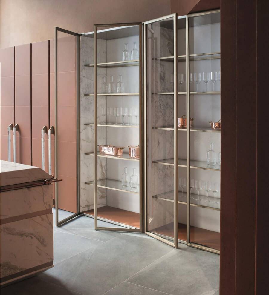 Взгляните на фото: вы видите пример отделки белым мрамором внутренних стенок шкафов–колонн. Здесь два вида дверей: из металла и из стекла. Металлические дверцы отделаны кожей.