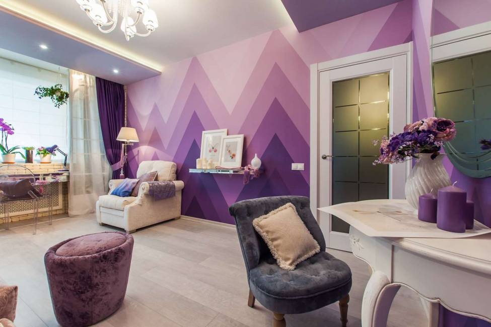 Красиво на общем сиреневом фоне будут смотреться геометрические формы и абстракция. Для каждой комнаты можно подбирать с различной сложностью узоров. Для спальни и гостиной сложные узоры подойдут идеально, так как они будут способствовать релаксации.