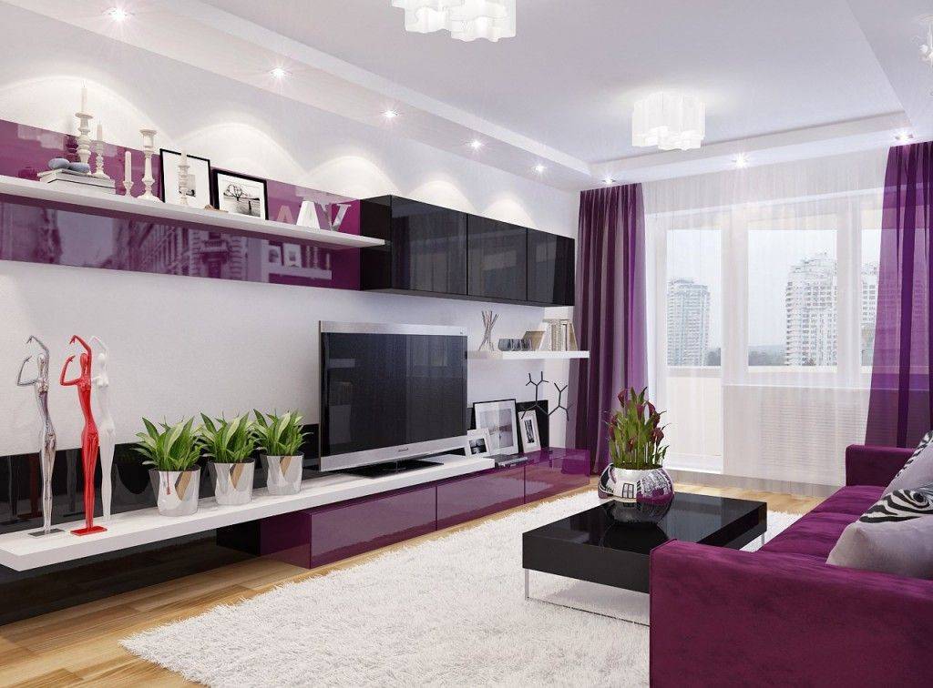 Зал в сиреневом цвете будет выглядеть загадочно. Его настроение можно менять в зависимости от цвета, с которым будет сочетаться сиреневый. Гостиную можно сделать игривой или спокойной.