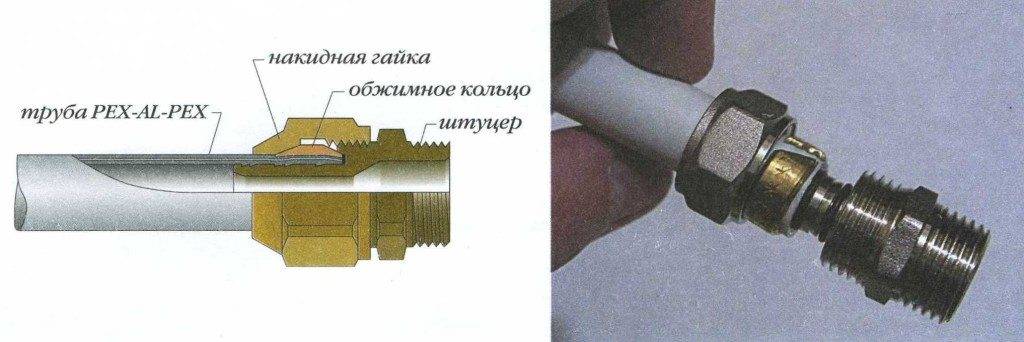 Технология соединения металлопластиковых труб при помощи компрессионных фитингов выглядит следующим образом: