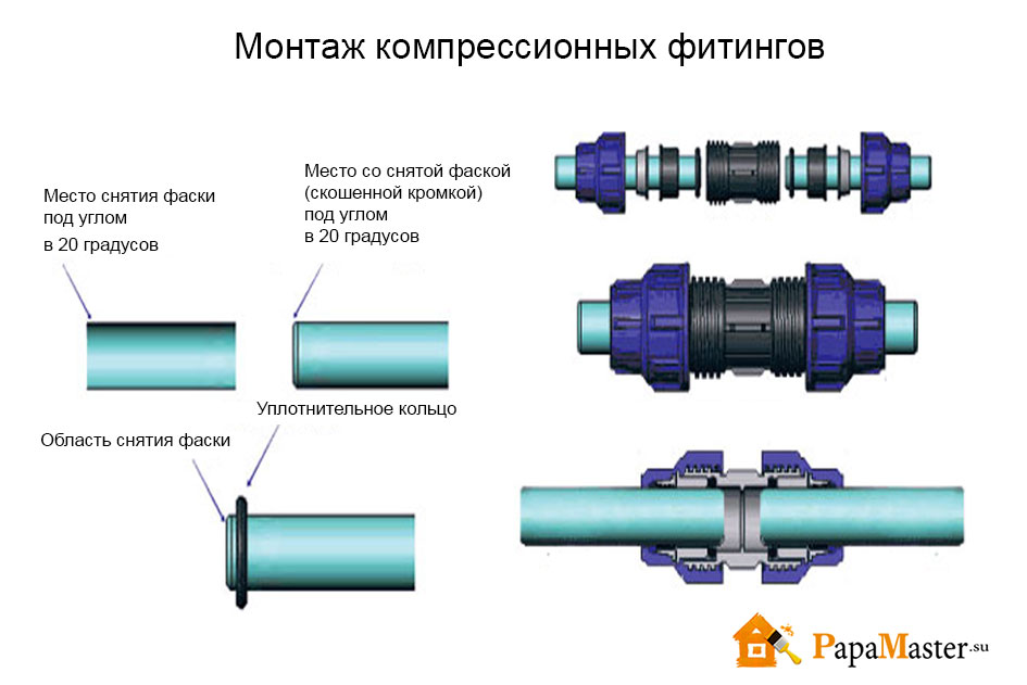 Их главным преимуществом можно назвать простоту использования, поскольку при применении фитингов для соединения труб, понадобится лишь обжимной ключ, который идет с этими же фитингами в комплекте. И все. Никаких сложных и специальных инструментов больше не требуется. К тому же ручная сборка значительно упрощает процесс соединения, хотя и несколько уменьшает его скорость по сравнению со сваркой с помощью специального аппарата .
