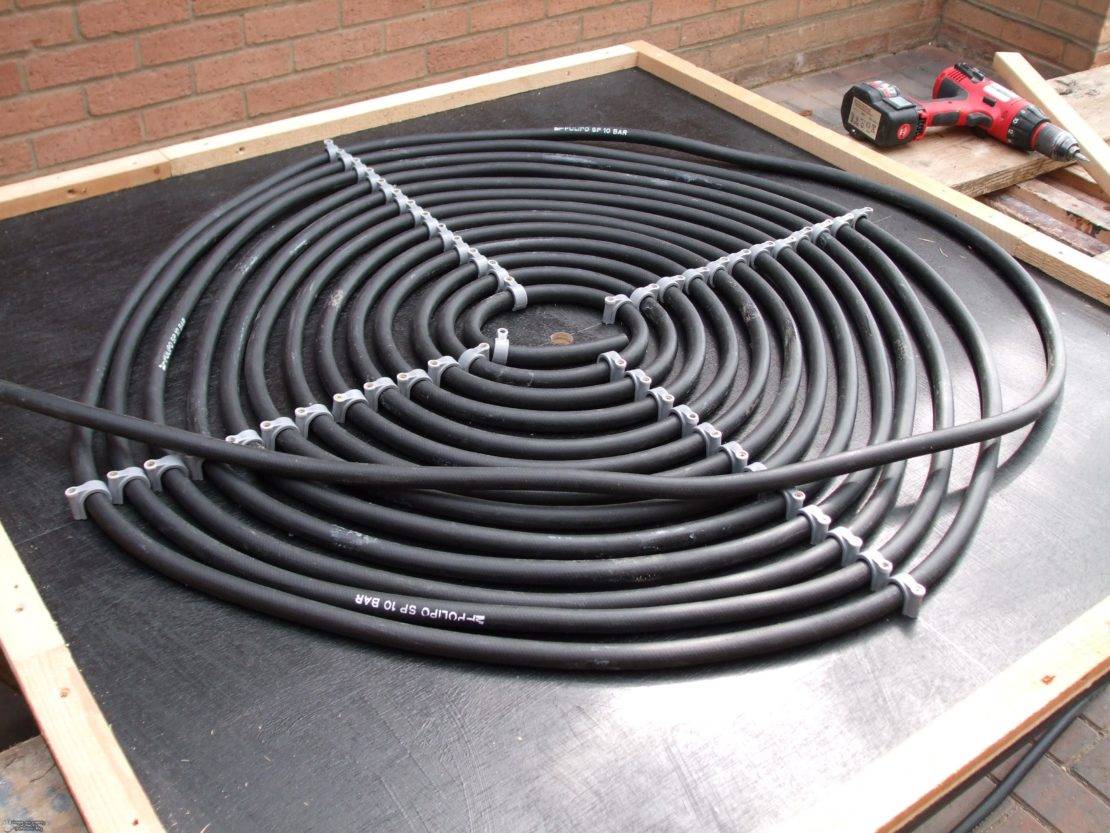 Часть материалов для такого коллектора, возможно, уже есть в гараже. Основа – черный резиновый шланг диаметром 20-25 миллиметров. В зависимости от того, сколько «улиток» будет создано, столько и уйдет материала: 100 или 1000 метров. Подойдет и черная пластиковая труба.