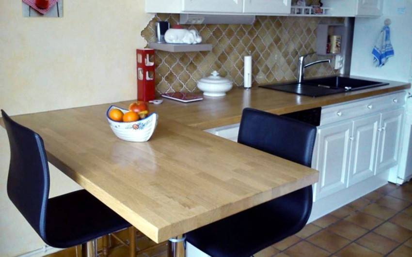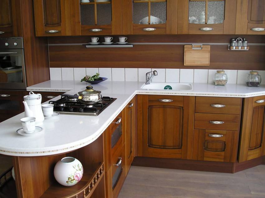 Преимущество деревянных кухонных столешниц в том, что им можно придать любую форму и размер. Легкость раскроя позволяет оформить кухню с учетом индивидуальных потребностей пользователей.