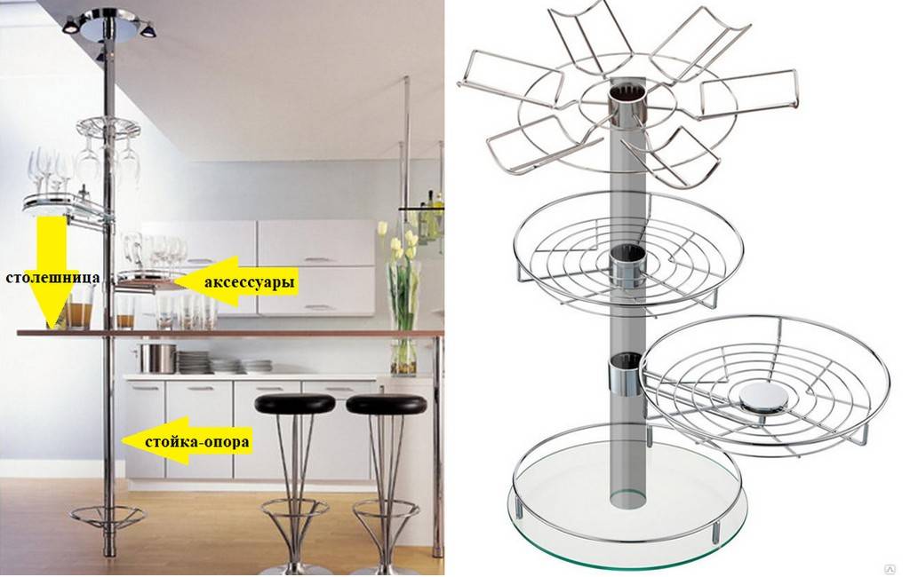 Открытая стойка выглядит легче в интерьере. Опорой при этом может служить хромированная труба, подстолье или ножка из любого другого материала. Для небольшой студии или маленькой кухни такой вариант предпочтительней.