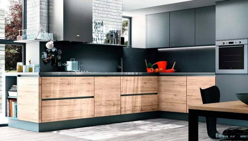 сыграть на контрасте со светло-серыми фасадами может черная техника. Например, глянцевый холодильник будет очень эффектно выделяться на светло-сером фоне;