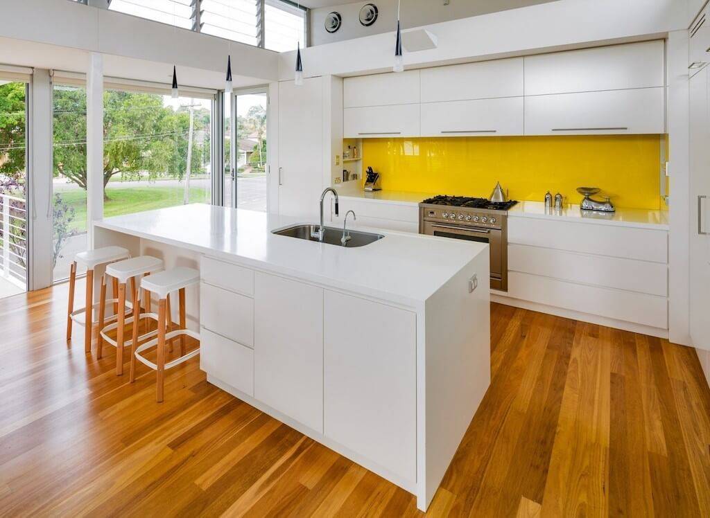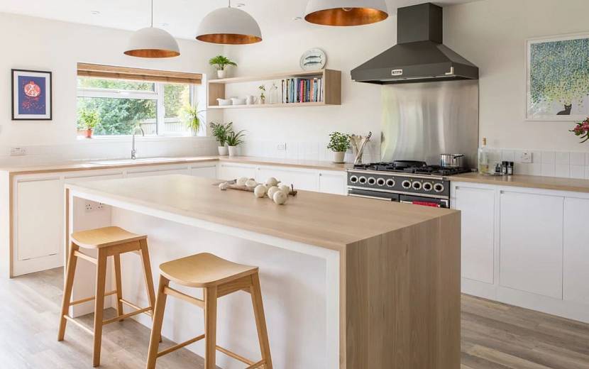 Столешница из клееного дерева в интерьере белой кухниИсточник pix-feed.com