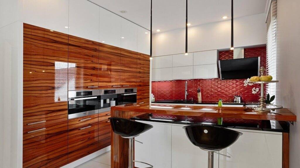 позволяет организовать мини-бар. Монолитные конструкции с встроенным под столешницей холодильником для охлаждения напитков, подсветка и соответствующий дизайн позволяют создать атмосферу кафе прямо у себя в квартире или доме. Такое решение точно придется по душе любителям устраивать домашние вечеринки;