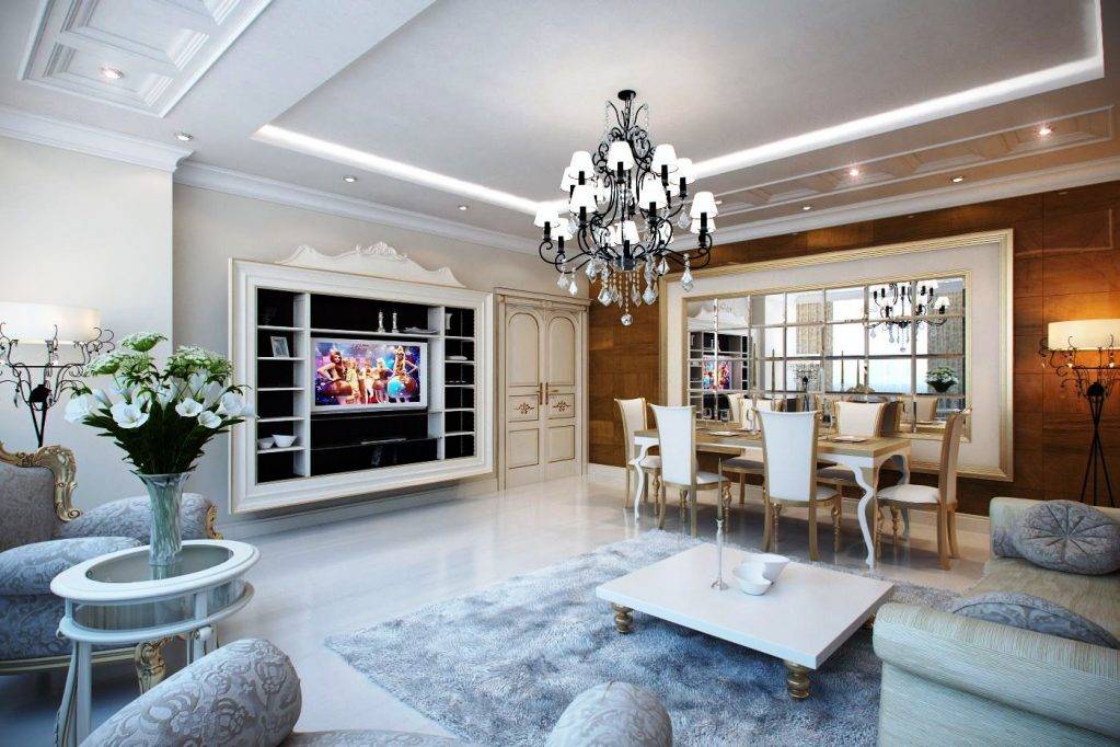 Помимо стандартного белого цвета, гостиную в классическом стиле выдерживают в нейтральных пудровых, голубых, розоватых или фисташковых тонах. Применяют бежевые, песочные и карамельные колеры, относящиеся к теплому спектру.