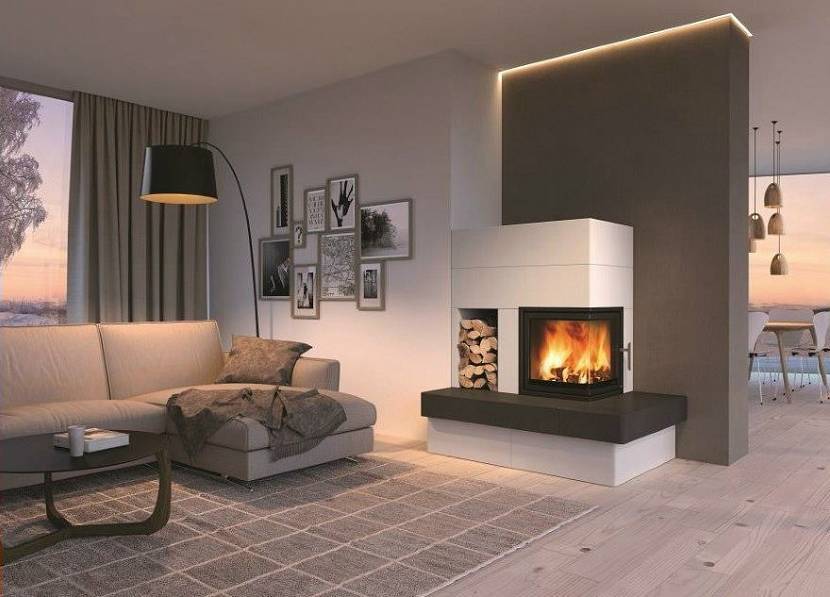 Угловые камины в гостиной не занимают много полезной площади, подходят для всех стилей. Компактные сооружения устанавливают в зону эркера. Модели закрытого типа безопасны для человека, их часто используют для прогревания комнаты. Если снять дверцы, то конструкция становится открытой.