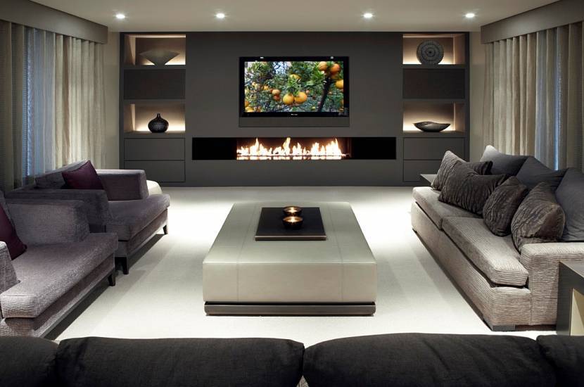 Если размеры помещения позволяют, то классический камин в гостиной встраивают в специальную нишу на стене. Создается уединенная огненная зона, в которую попадают кресла. В квартире часто используют электрический или биоочаг, поэтому в грот дополнительно помещают телевизор. Миниатюрную мобильную топку прячут в углубление, облицованное красным кирпичом.