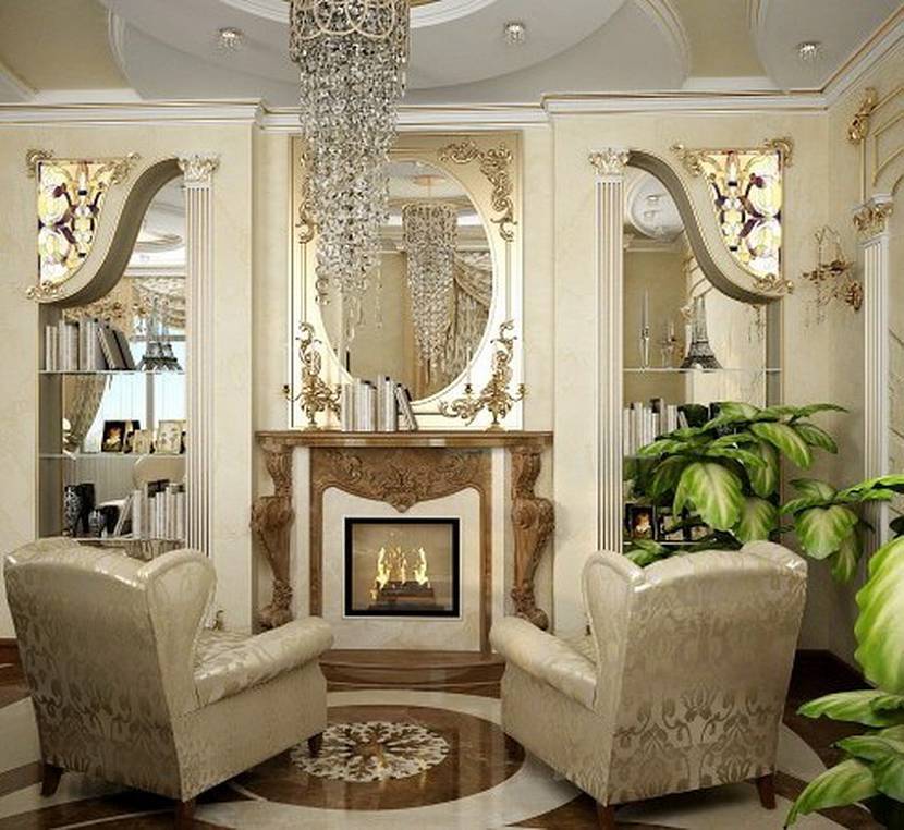 Проверенное временем направление сложно представить без очага. Массивный встроенный портал занимает большую часть стены, а рядом располагается пара кресел. Над конструкцией монтируют огромное зеркало в тяжелой раме или картину. Поверхность сооружения украшает сложная лепнина и подпирают колонны. Для оформления используют натуральные материалы: