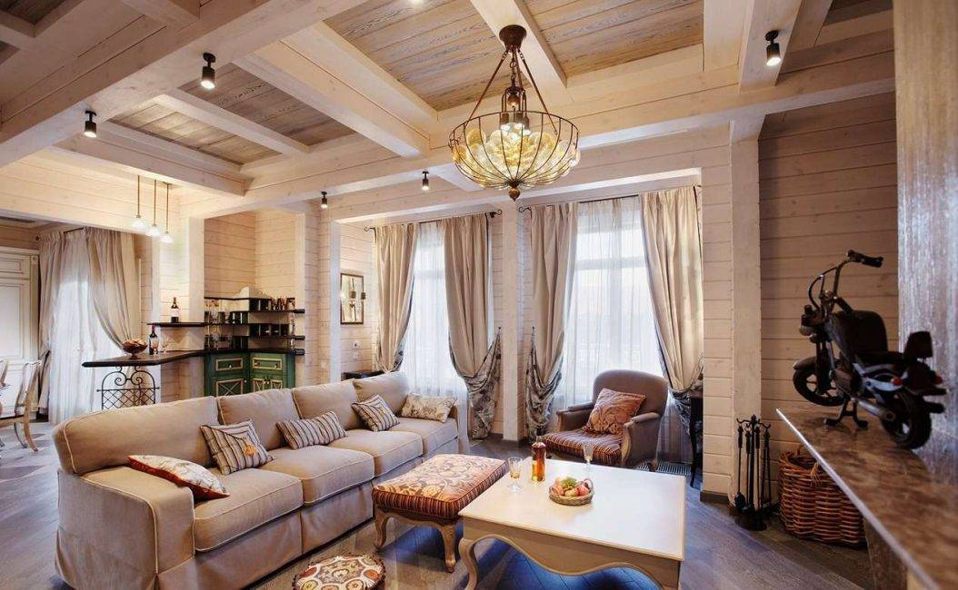 На фото гостиная в стиле прованс с потолком, оформленным резной люстрой светлого оттенка.