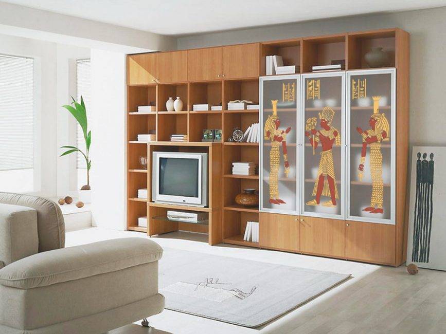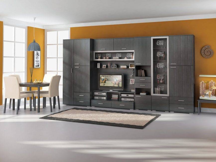 Этого достаточно, чтобы спрятать одежду, поставить телевизор, разместить периферию. Встречаются мини-стенки 3 типов: