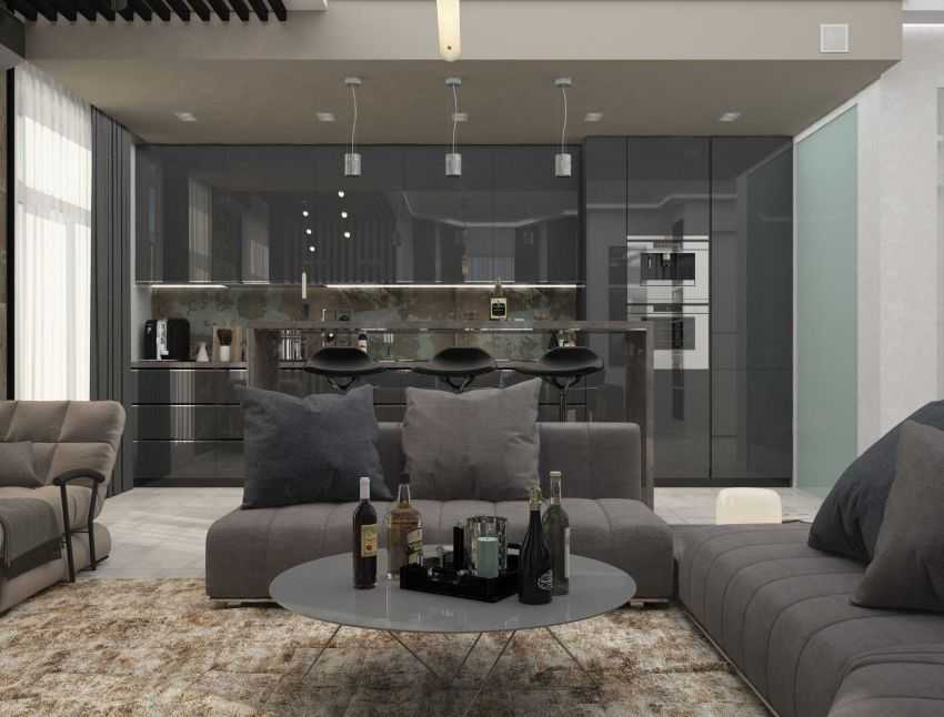 Минимализм предполагает максимум блестящих, отражающих свет поверхностей. А такие фасады и панели, даже темного цвета, визуально расширяют пространство комнаты.