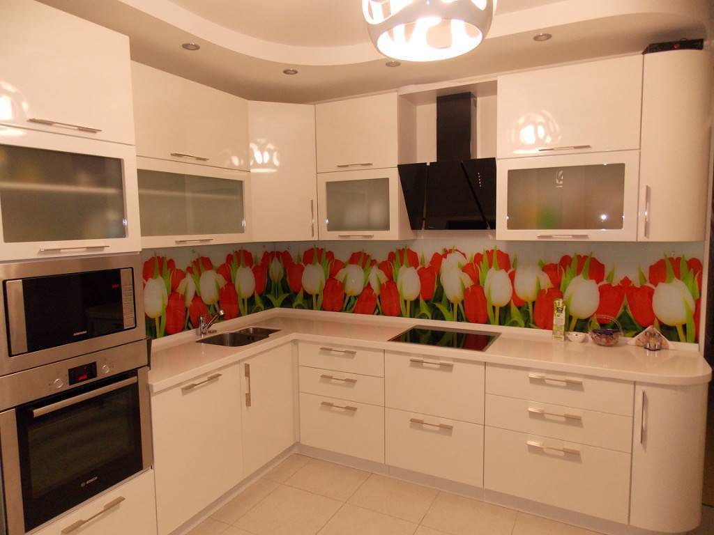 Хорошо смотрятся стеновые панели из того же материала, из которого изготавливается сама кухня. Большой популярностью пользуются красочные привлекательные фартуки из стекла с фотопечатью.