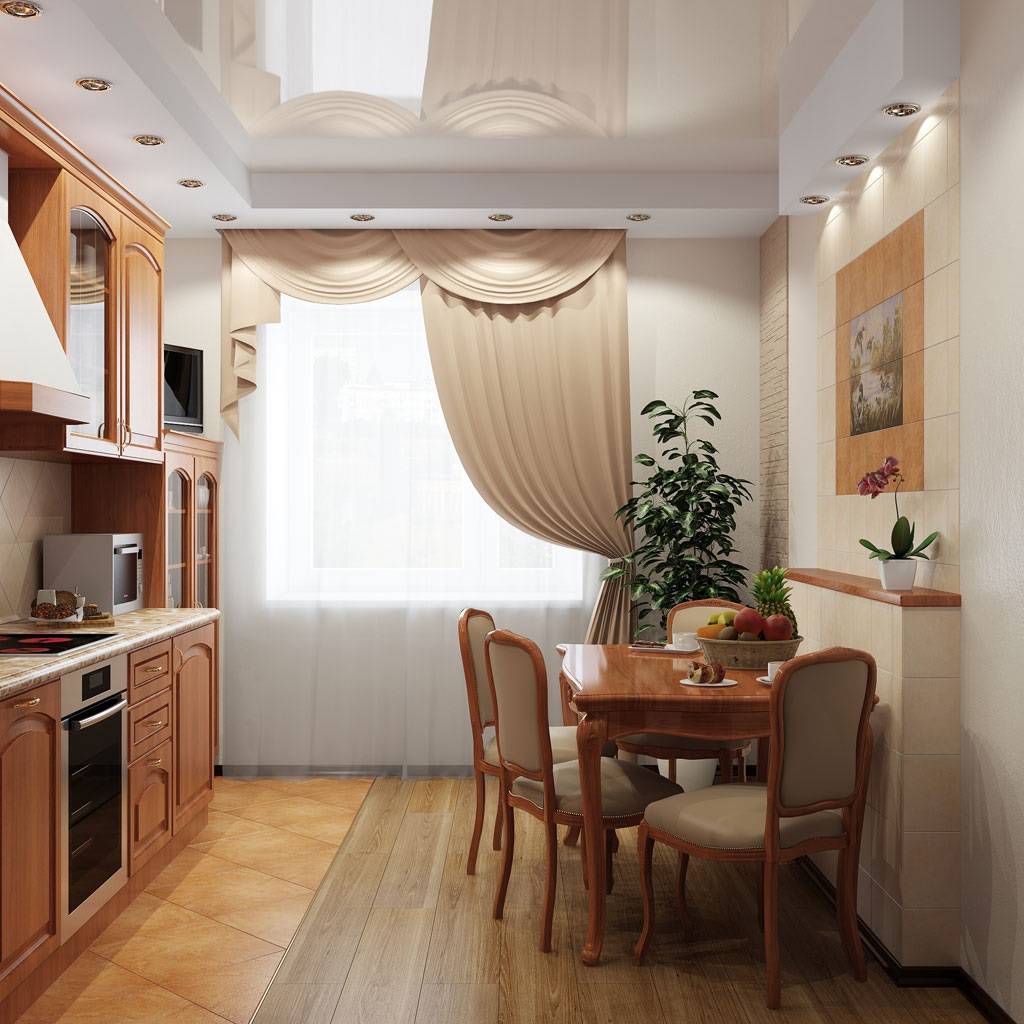 В качестве примера рассмотрим наглядные фото длинных штор на кухнях новинки в различных стилях.