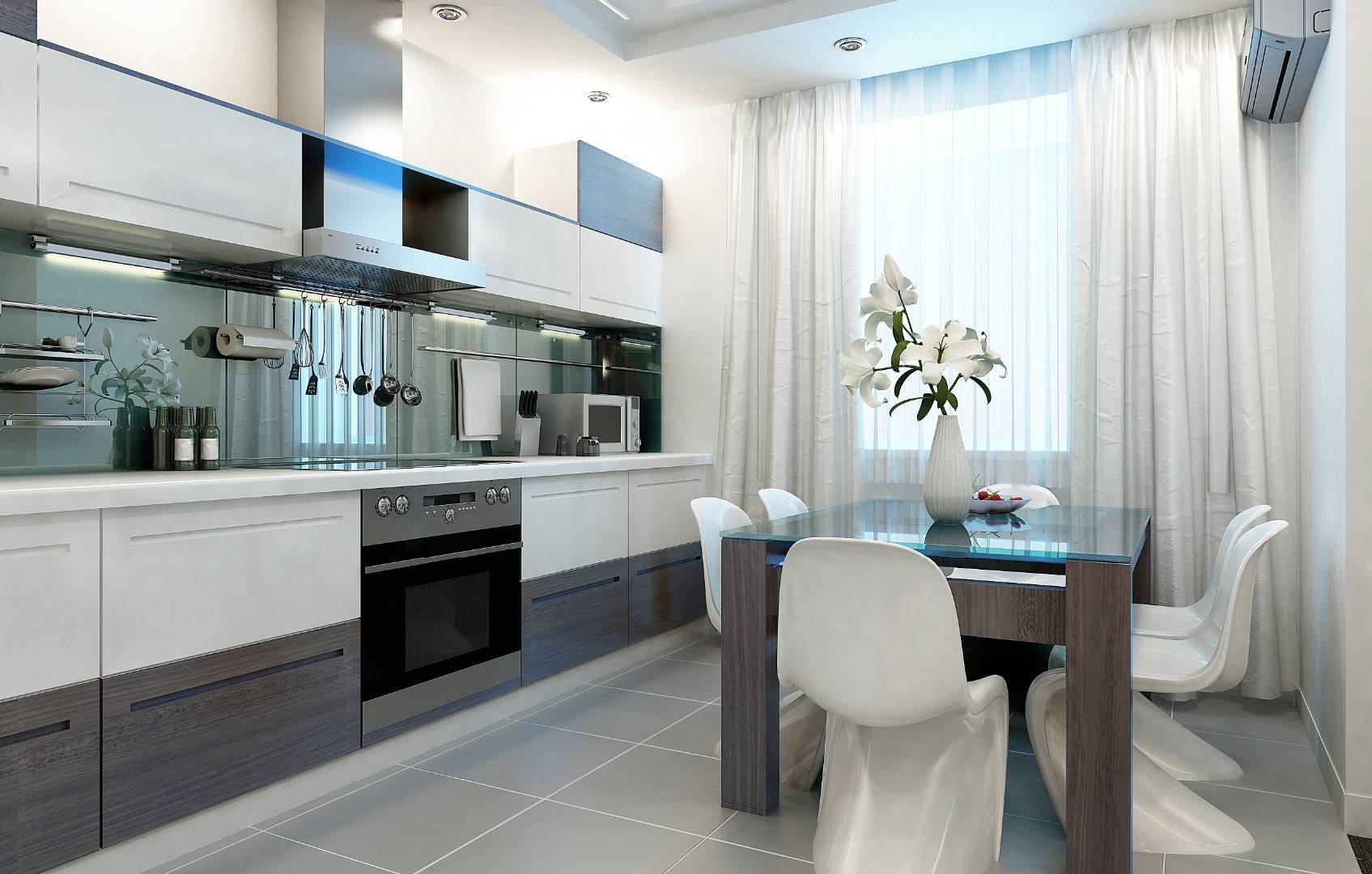- Фото 5. На этой кухне бросается в глаза правильно организованный контраст. Вся комната (даже пол) белые. Шторы – классические, по цвету темно-коричневые, на них дизайнер сделал акцент. Сбоку от столешницы, почти перпендикулярно к ней, находится вытянутый овальный стол. Плита для готовки отдалена от окна настолько, насколько это вообще возможно.