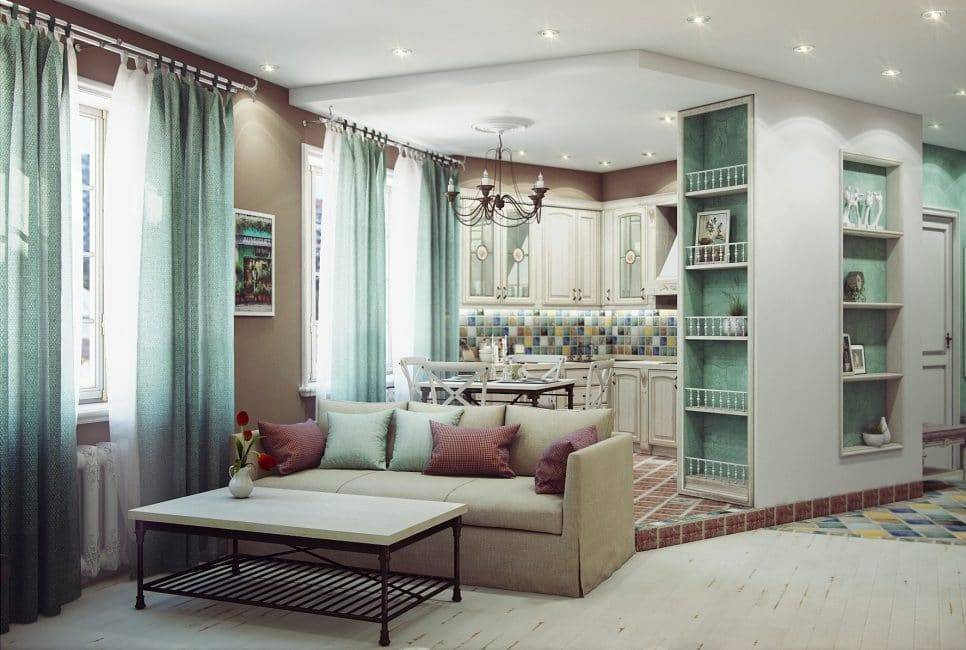 Примените практичный гарнитур из дерева в тон мебели гостиной, светлые шторы с цветочным мотивами, горшки и банки для специй. Если кухонный скарб и контейнеры в стиле Прованса лучше размещать на открытых полках, то современные кухонные приборы лучше хранить во встроенной и максимально «замаскированной» форме.
