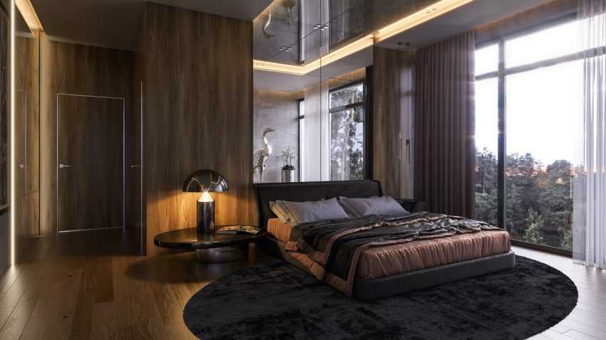 Идеальный пол — дерево, паркет или ламинат. Они во все времена выглядят стильно, подчеркивают красоту комнаты и дают приятные тактильные ощущения, если человек ходит по дому босиком. Пол в современной спальне можно дополнить ковром. Не слишком маленьким, чтобы он не терялся в огромном пространстве.