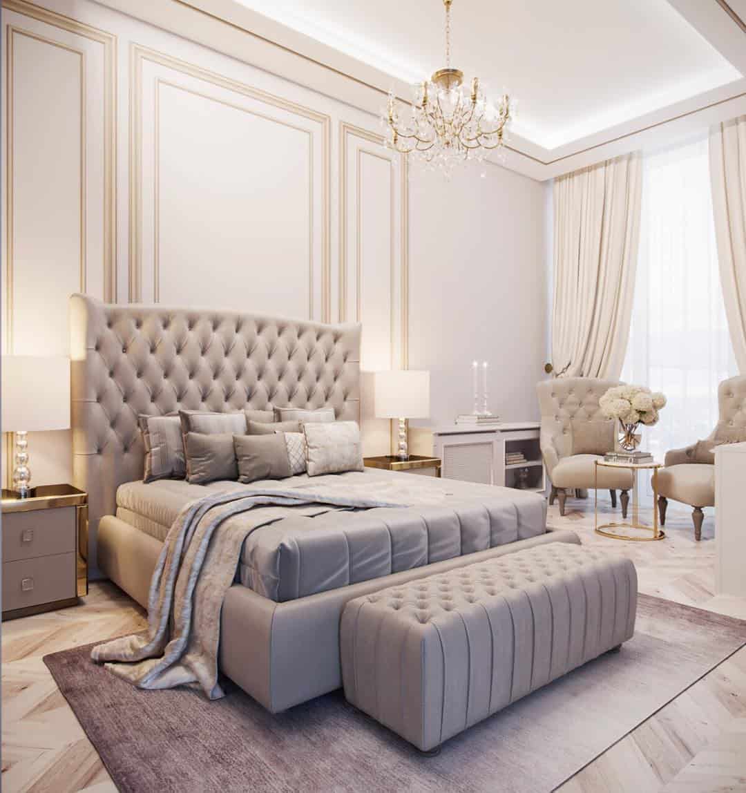 Одним из основных требований является использование арок и колонн. Но подобное возможно лишь в случае, если спальня достаточно большая и имеется много свободного места. В других случаях рекомендуется использовать лепнину.