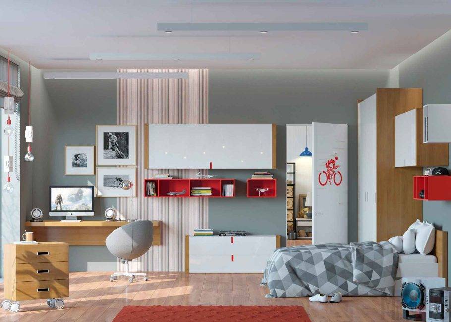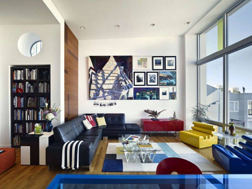 Контрастная мебель яркого оттенка — акцент комнаты, который будет привлекать внимание хозяев и их гостей. Яркие обивки, броские фасады могут быстро утомить, поэтому их лучше использовать умеренно