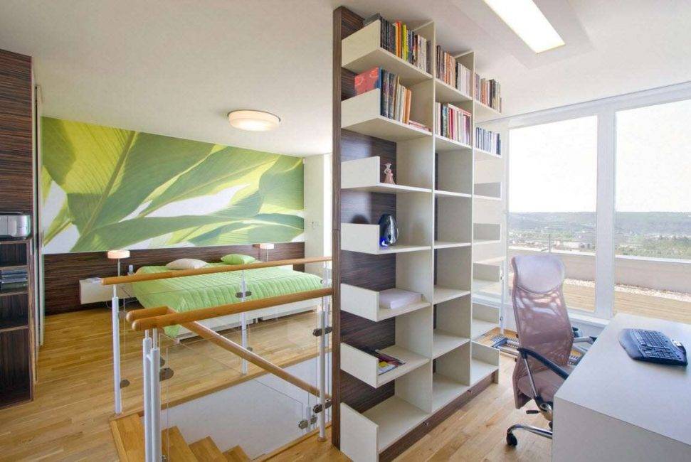 Например, встроенный шкаф для книг разделяет комнату на рабочую зону и спальню. Такие решения снижают расходы на отделку помещений, их можно точно «вписать» купленные в габариты комнаты, рационально используя свободное пространство.