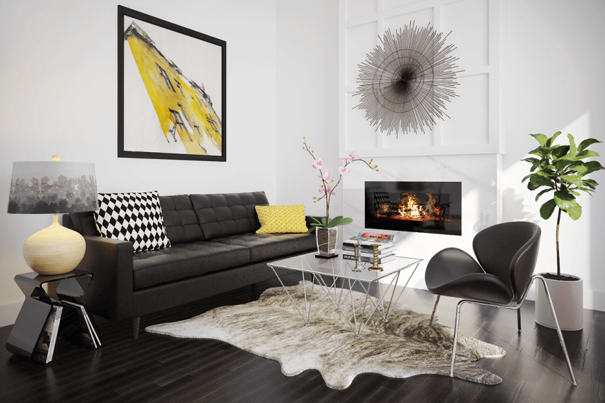Белый, серый или черный в гостиной могут быть базовыми цветами, которые дополняются желтым или оранжевым; красным или зеленым.