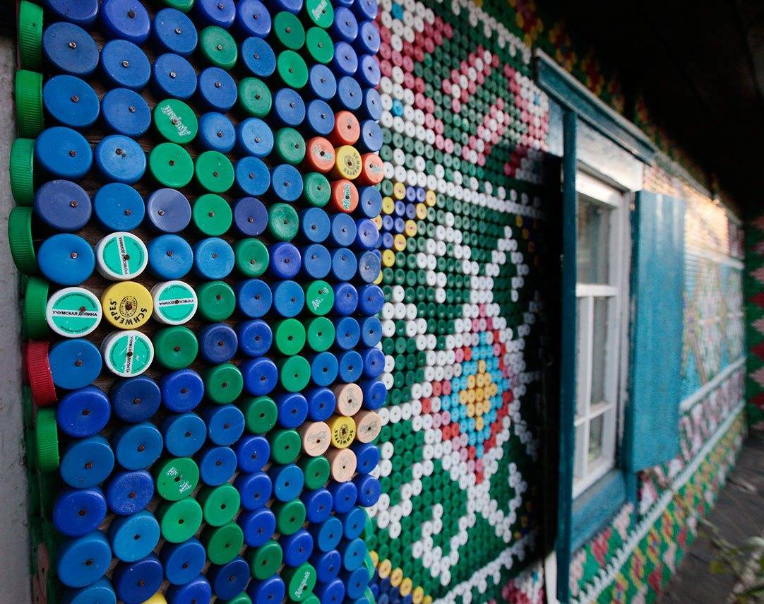 Многие народные умельцы стараются сделать свой дом красивым не только внутри, но и снаружи. А , чтобы дом стал нарядным? Конечно, красивые панно на наружные стены. Чаще всего дома украшают при помощи орнаментов, выкладывая их из одинаковых по размеру, но разных по цвету крышек.