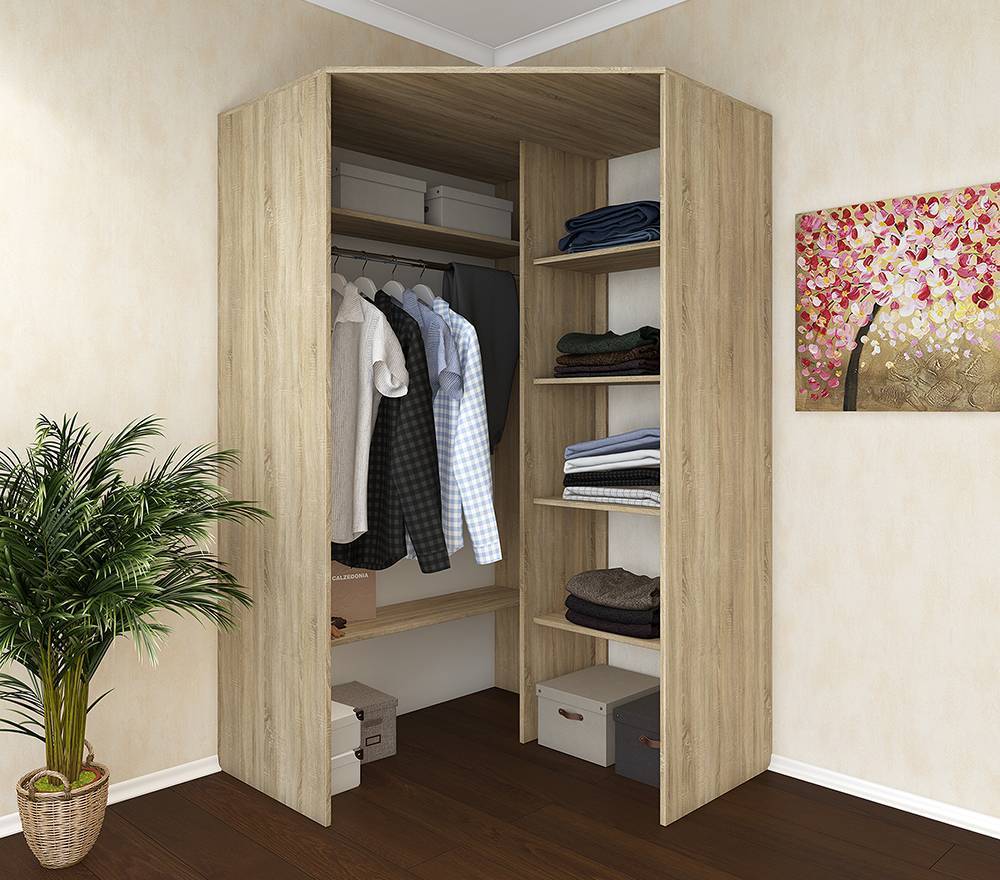 Размеры шкафа рассчитываются, исходя из возможностей пространства. Минимально возможной считается конструкция, занимающая 600˟600 мм от угла. Для достаточной ширины фасада (не менее 400 мм) глубина боковин не должна превышать 300 мм. Такой миниатюрный шкаф сопоставим по габаритам с навесным кухонным модулем и может быть оборудован только крючками для одежды и полками. Штанга в него уже не поместится.