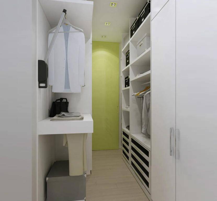 В гардеробной комнате подобного размера смело можно хранить большое количество повседневных вещей. Здесь можно смело поставить бытовую технику, например, утюг или пылесос.