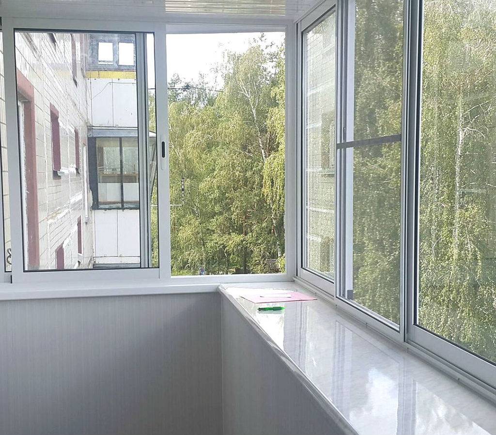 Остекление балконов с выносом. Фото демонстрирует распашные окна и узкий подоконник. Хоть и не полка, но место сэкономлено.