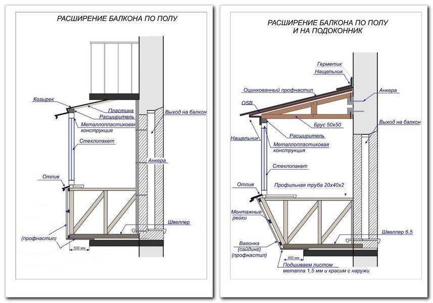 Существует два способа увеличения балкона и лоджии: расширение по подоконнику и по полу .