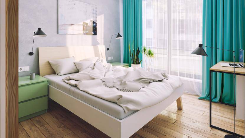Для спальни важно подобрать плотные занавески, которые будут надежно защищать комнату от яркого солнечного света из натуральных тканей, к примеру, льна или хлопка. А вот от балдахина над кроватью необходимо отказаться, так как он сделает комнату визуально еще меньше